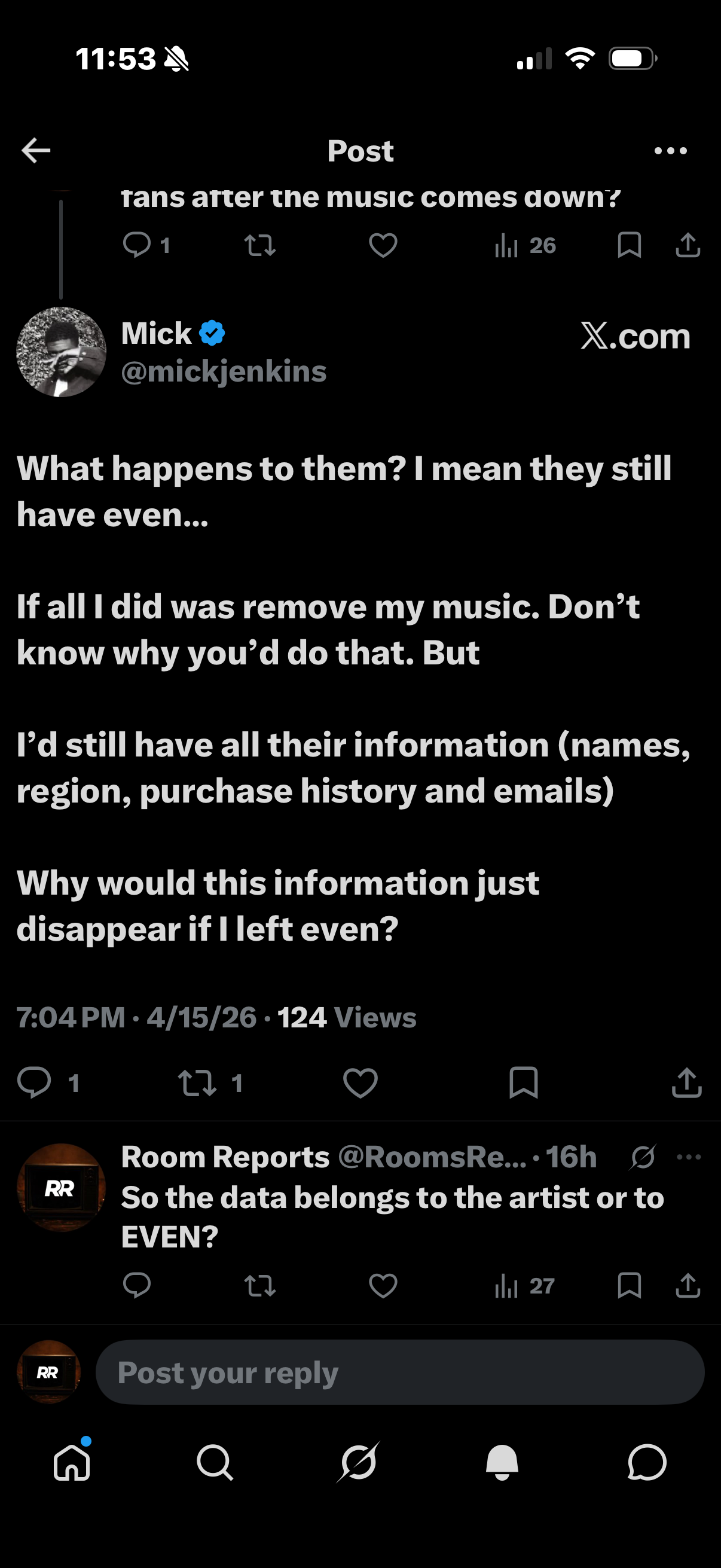 Mick Jenkins confirmed on record that fan data collected through EVEN, including names, region, purchase history, and email addresses, remains to artists after they remove their music from the platform.