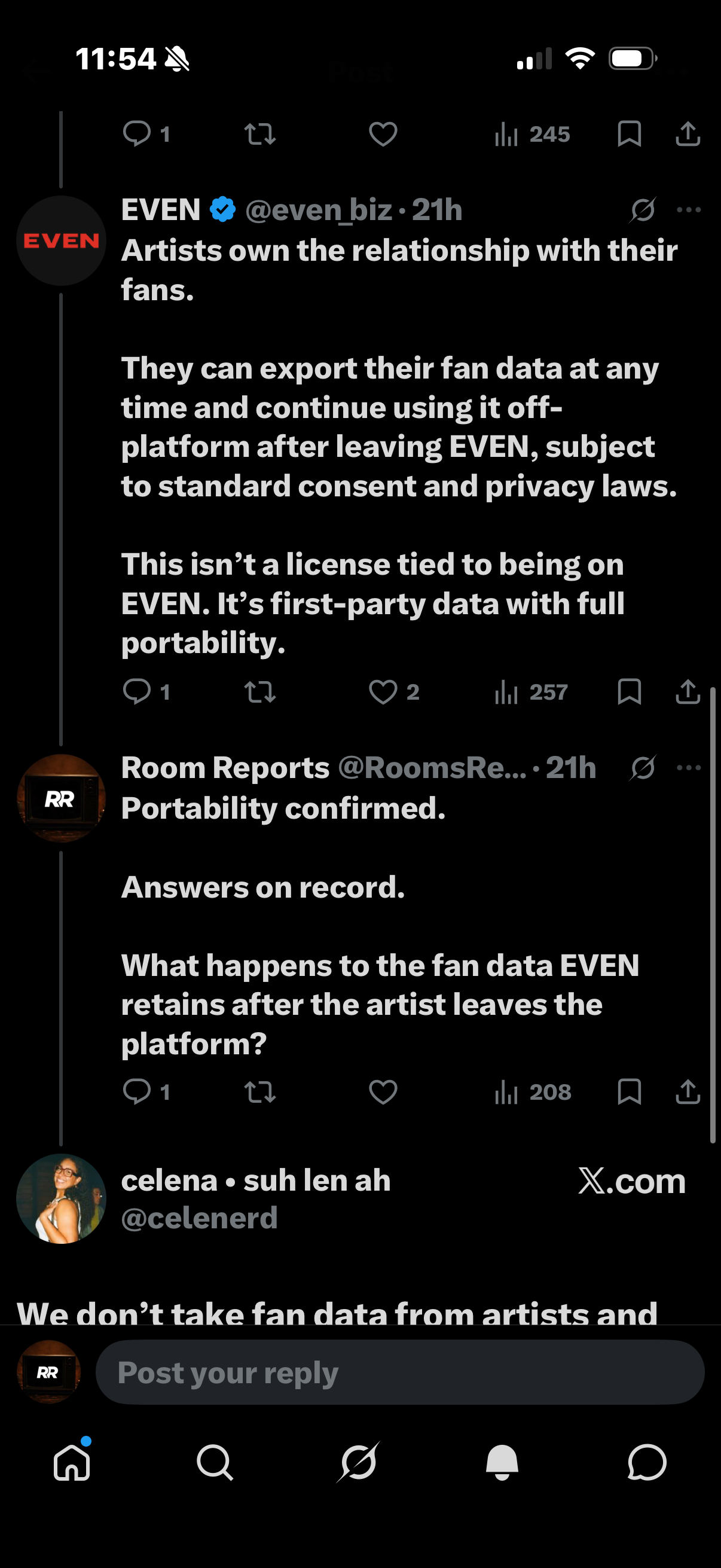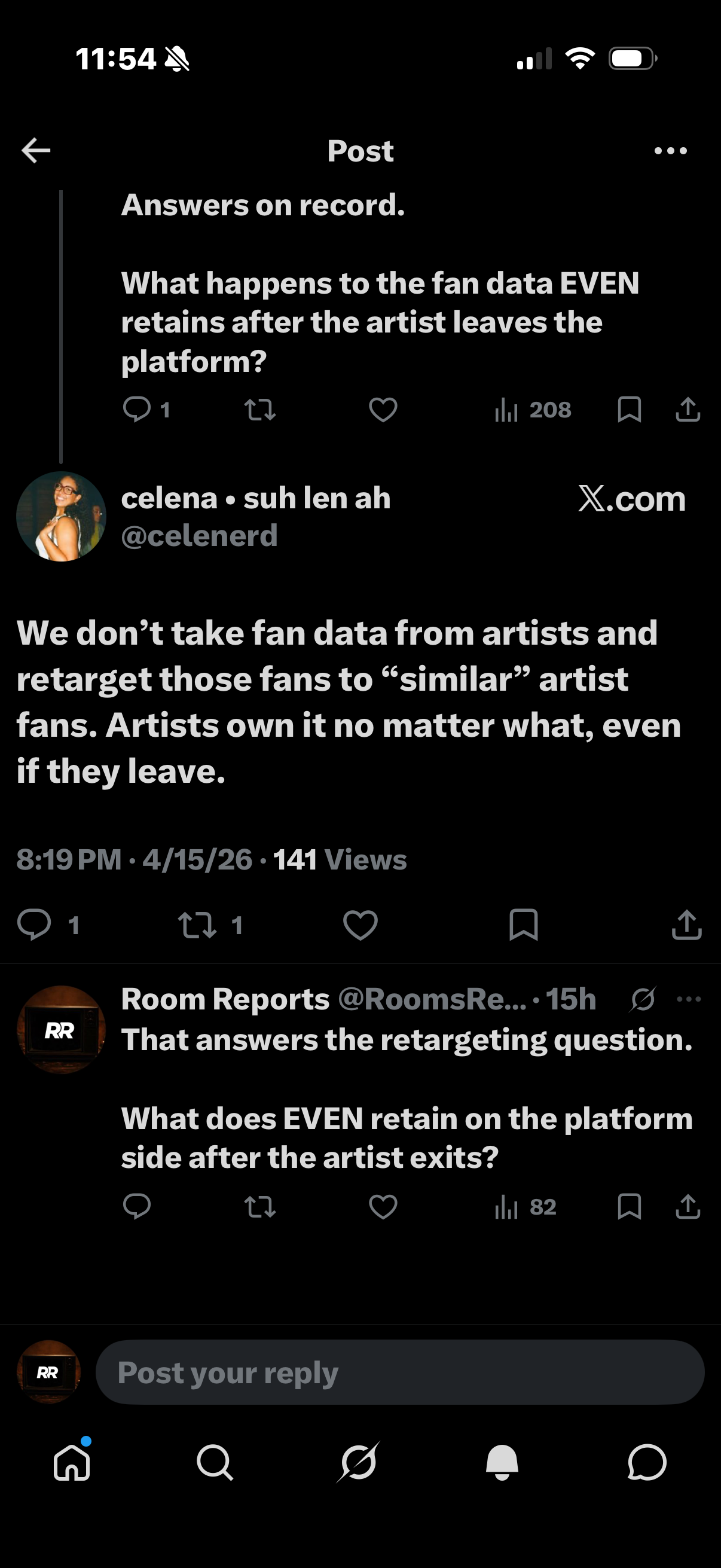 Celena Fields, Head of Artist Relations at EVEN, confirmed that the platform does not engage in retargeting after an artist exits, and that the artists retain full data portability rights over what was collected.